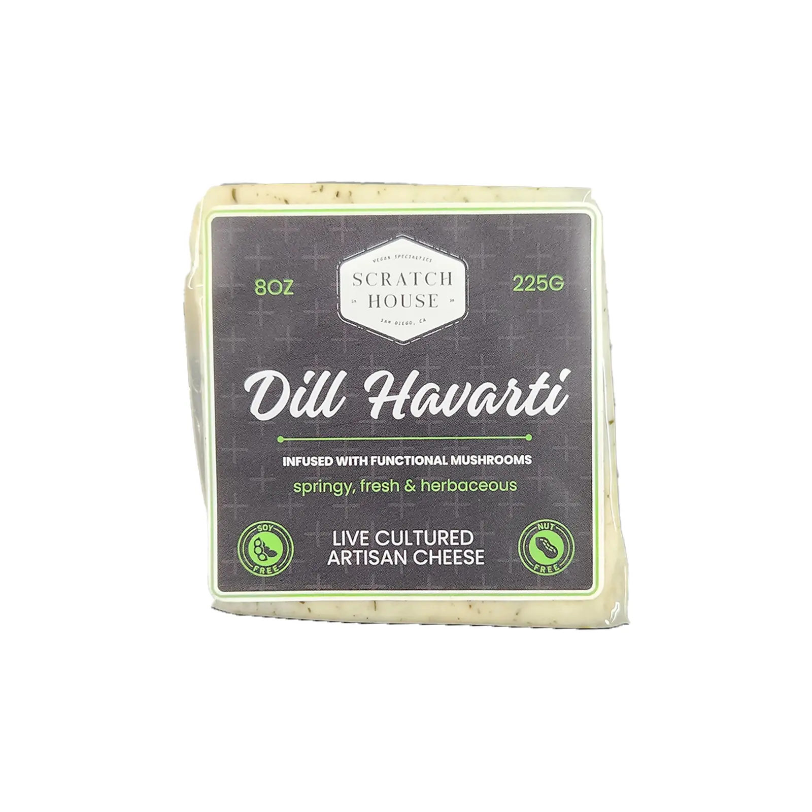 This creamy, smooth Havarti is infused with dill, Mediterranean oregano, and a pop of white peppercorn. Ready for your next cheese board or to elevate any sandwich or wrap to the next level. Now infused with functional mushrooms! Gluten-Free, Soy-Free, and Nut-Free. Semi-Firm. Meltable.