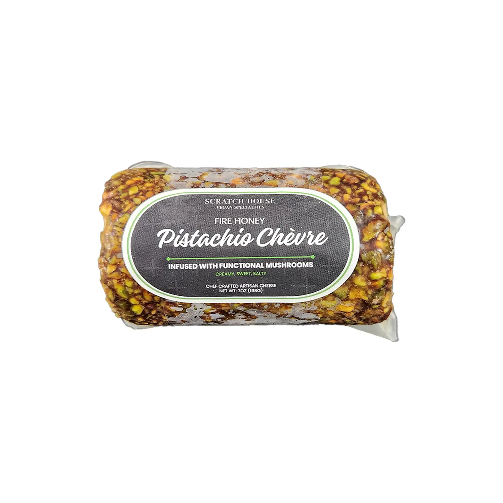 This chevre is a tangy fermented cashew base infused with Scratch House’s signature vegan fire honey and coated with roasted pistachios for a sweet and salty finish with a little kick to balance it all out. Sure to be a show stopper on your next board. Infused with functional mushrooms. Gluten-Free and Soy-Free. Soft Texture.